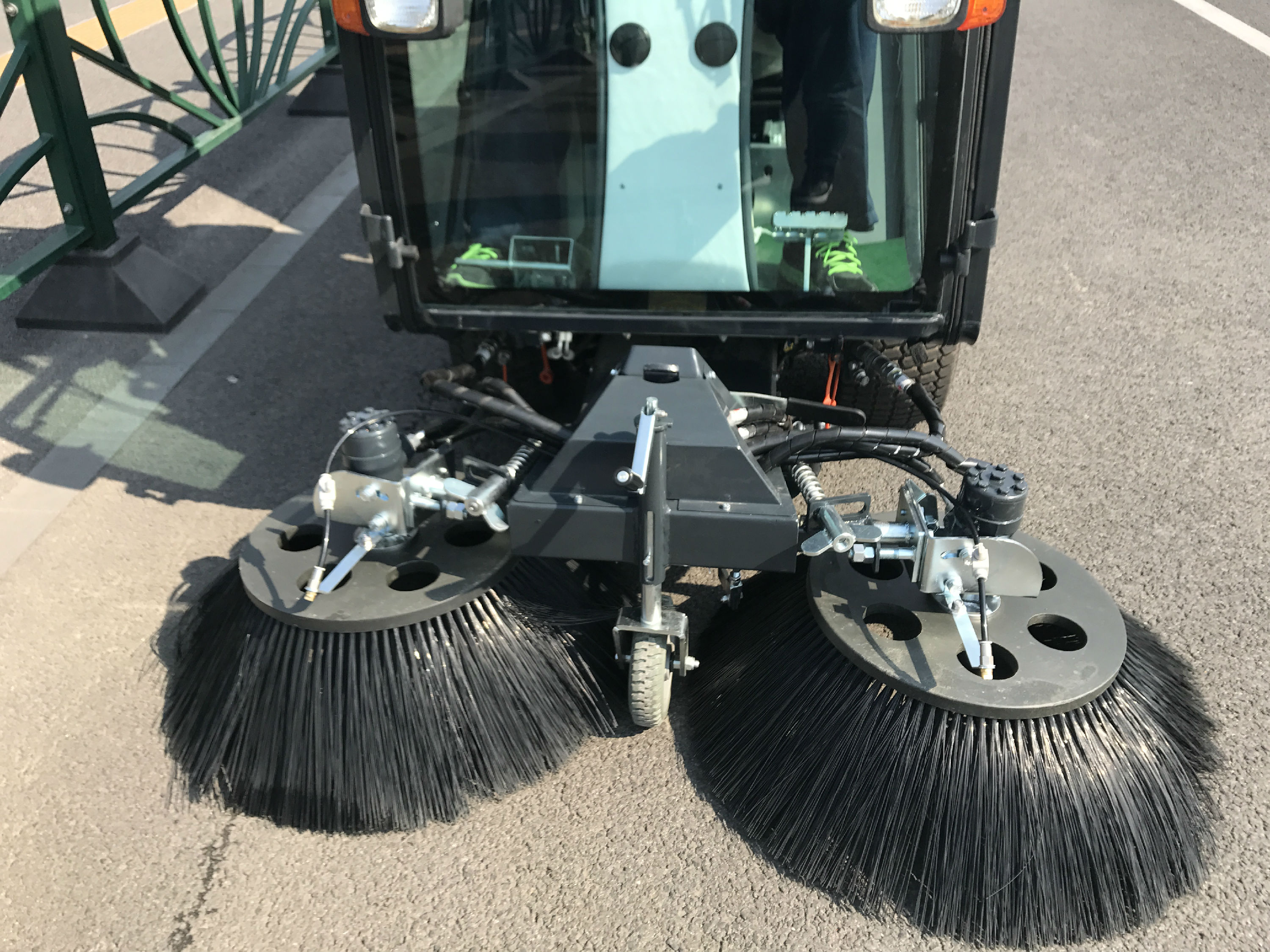 清掃機(jī)兩掃刷布置于駕駛室前方兩側(cè),吸口布置于駕駛室下面中間,清掃作業(yè)視野良好操作便捷。清掃機(jī)清掃作業(yè)時不會產(chǎn)生二次污染,清掃機(jī)安裝有國家專利的揚(yáng)塵過濾裝置,杜絕二次揚(yáng)塵。